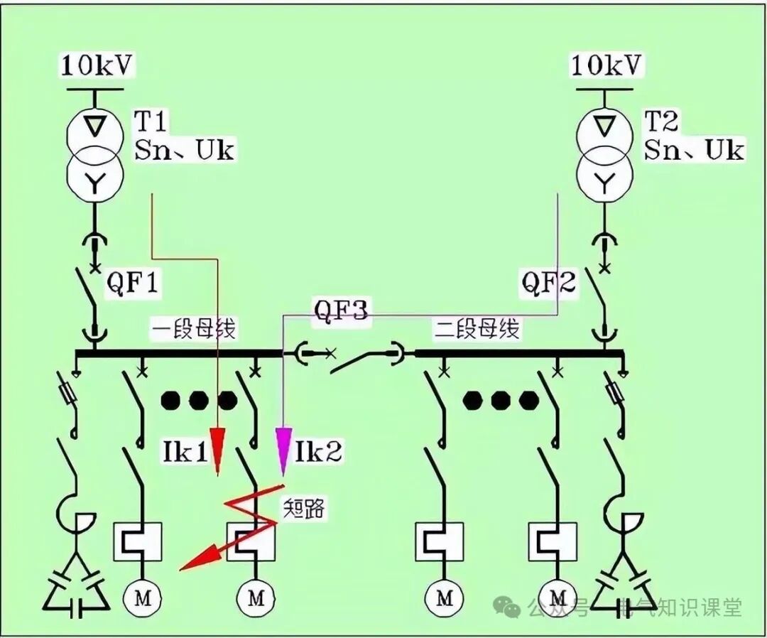 當(dāng)一段母線的負(fù)載出現(xiàn)短路時(shí),兩臺(tái)變壓器均向短路點(diǎn)貢獻(xiàn)短路電流,因此負(fù)載處的短路電流等于單臺(tái)變壓器短路電流的兩倍。